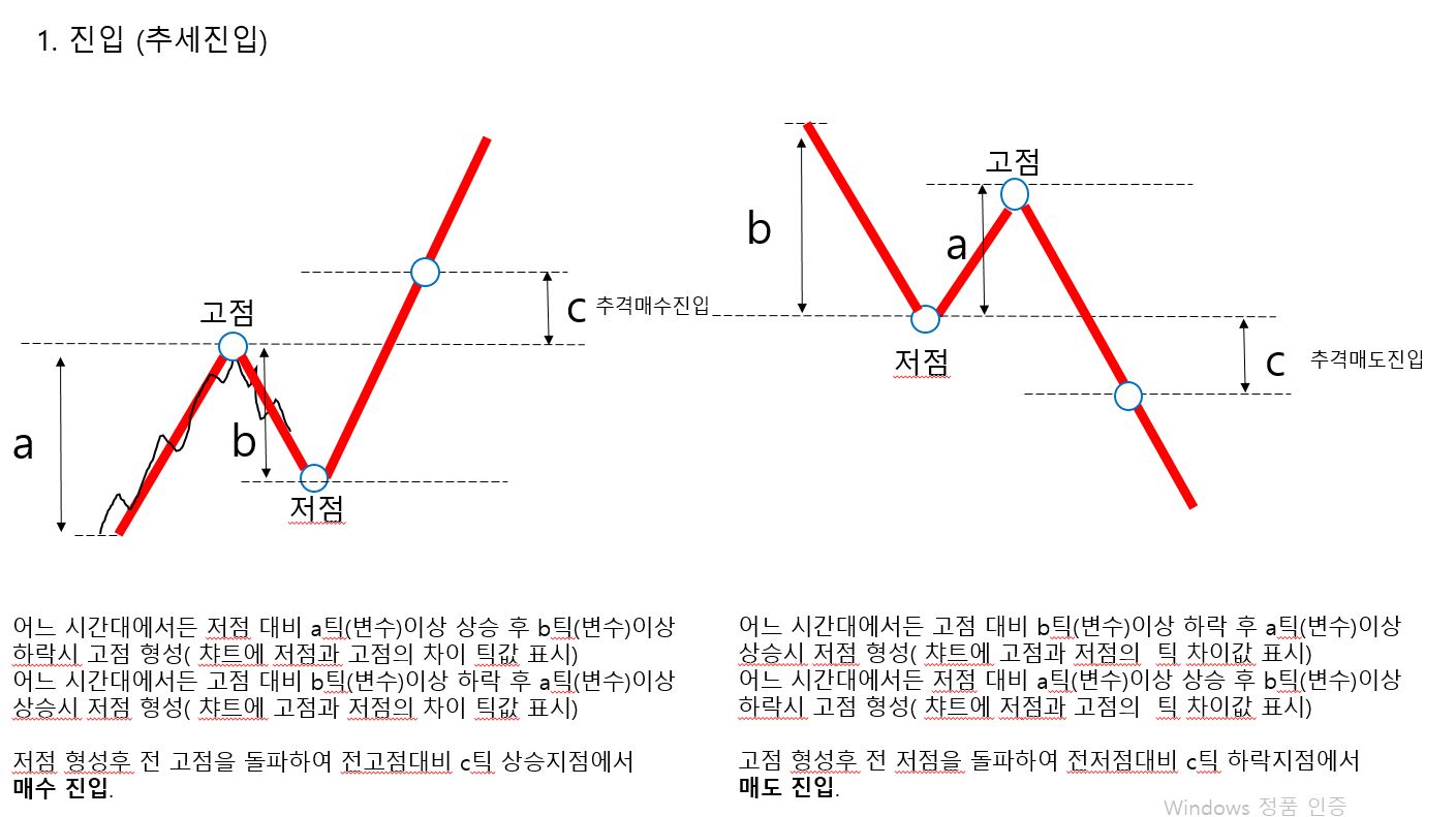-매수진입: 저점 형성후 전고점을 돌파하여 전고점대비 c틱(변수) 상승지점에서