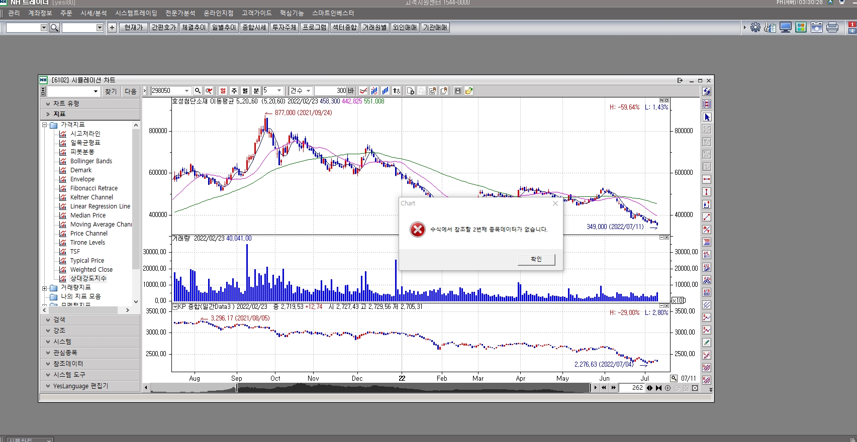 효성첨단소재(코스피종목)이면 코스피 종목의 차트를 놓고 상대강도지수 지표를 클릭하면