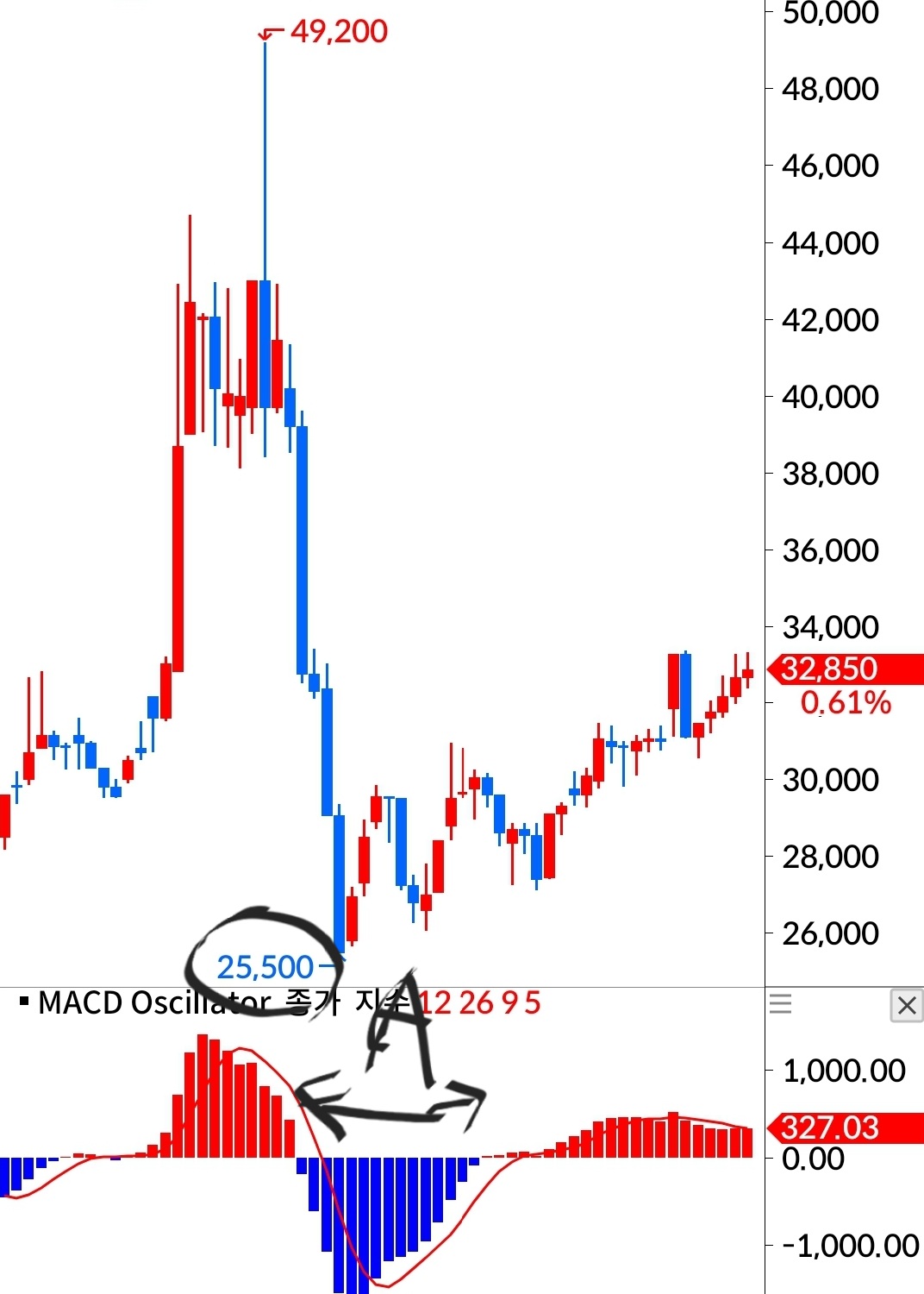 3. 손절: macd 오실레이터가 양수로 바뀌기 전의 음수인 영역(첨부 사진에서 A영역)에서의 최저값(첨부 사진에서 A영역 최소값은 25500원)보다 종가가 작아지면 손절