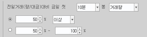 - 전일거래량대비 금일 첫 10분봉 거래량 50%이상