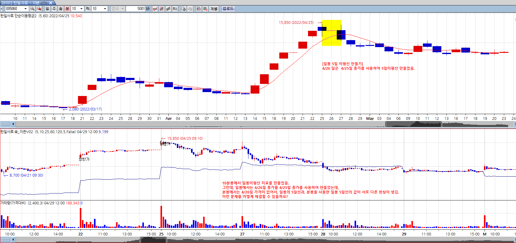 분봉에서는 4/26일의 데이터가 없어서, 4/27일부터 분봉의 일봉이평값과 일봉의 5일선 값이 서로 다른 결과가 나와서 애를 먹고 있습니다.