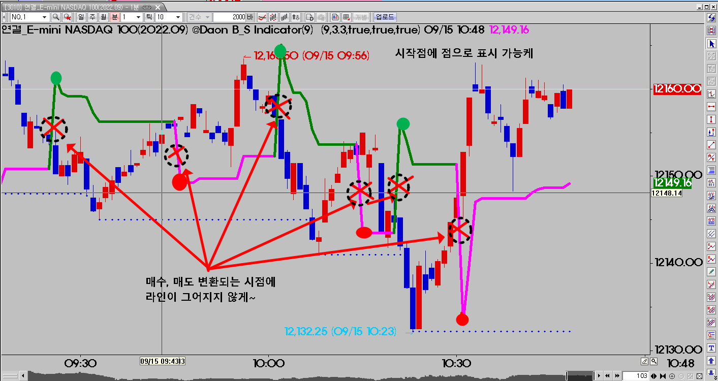 첨부 그림과 같이 매수, 매도가 전환이 될 때 라인도 같이 내려오거나