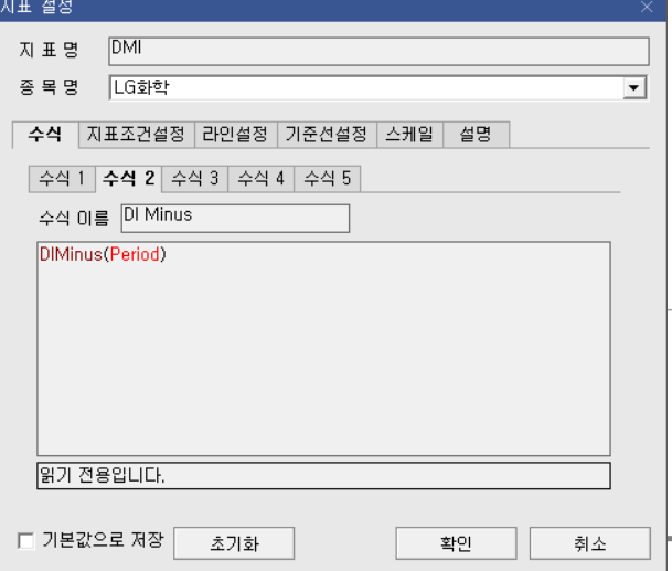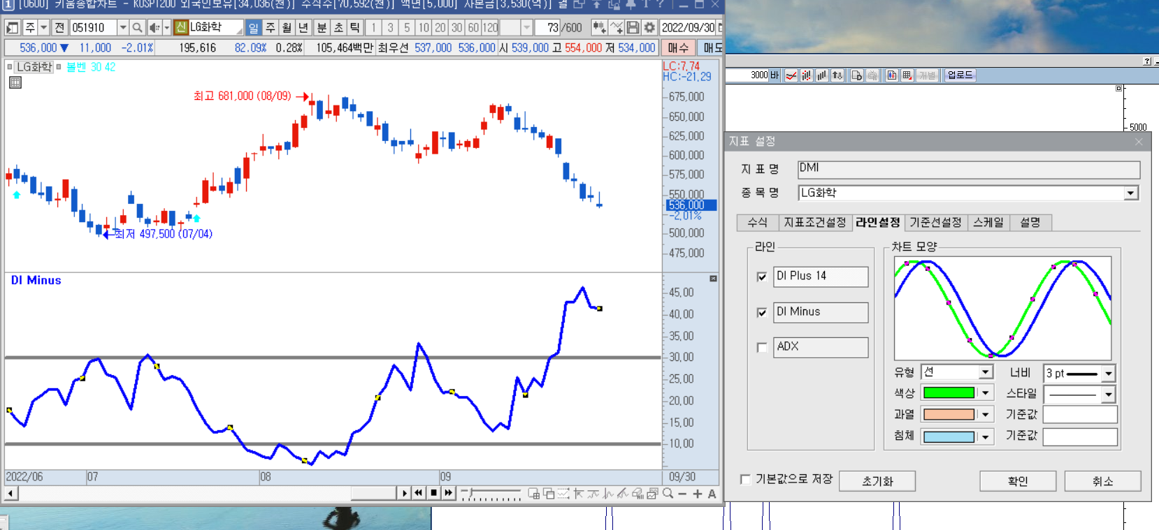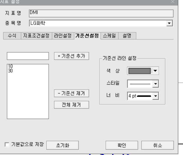 키움 DMI 지표입니다 플러스 마이너스 라인만포시 부탁드립니다 기준선 30 10 부탁드립니다 변수처리 부탁드립니다
