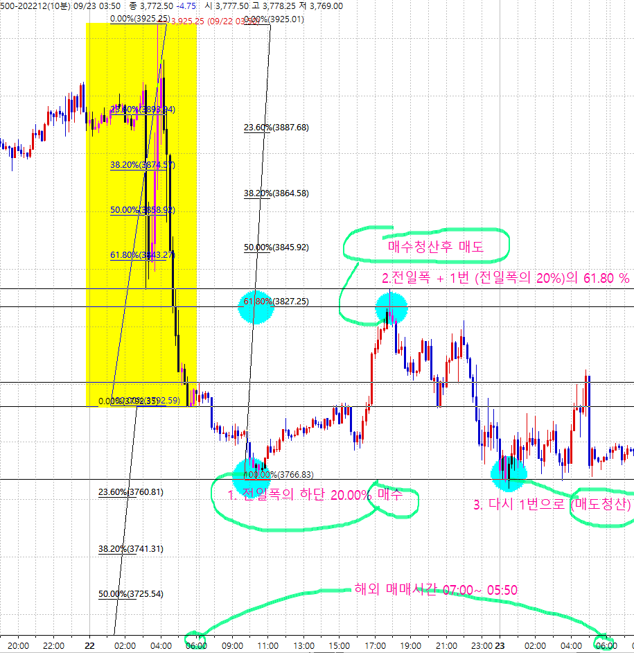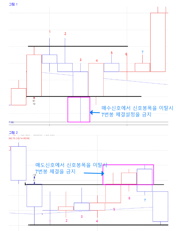 캔들중 하나라도 처음 캔들신호폭을 이탈하면 7번재 캔들싯점에서 체결이 없고