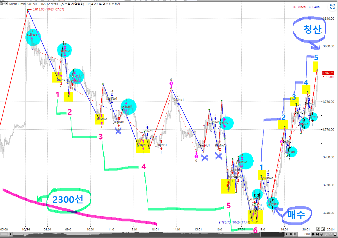 계단식 상승 6파동후 매도 2번째 신호시 체결후 하락 5파에 청산하는식을