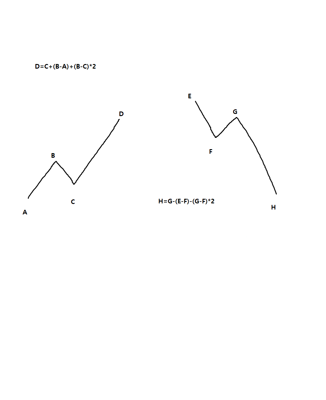 > 전일과 분리되어 당일부터 시작되는 종가 파라볼릭이 양전환되면 이번 바닥에서 직전 양전환시 상승폭과 직전 음전환시 하락폭 2배를 플러스한 위치를 표시한다. 파라볼릭이 음전환되면 이번 천정에서 직전 음전환시 하락폭과 직전 양전환시 상승폭 2배를 마이너스한 위치를 표시한다.