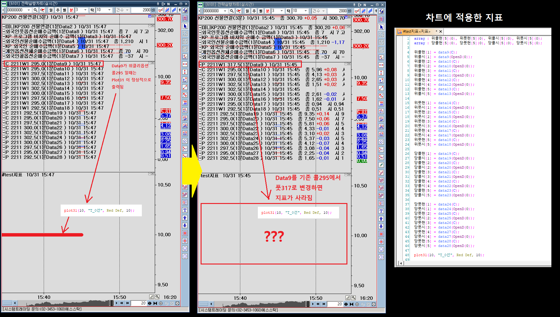 매우 이상한 점은, Data9를 어떤 종목으로 변경했을 때 지표 출력이 않되는지가 일정하지 않다는 것 입니다. 예를 들면 오늘(11월31일(월))은 풋317과 풋312 모두 거래가 없었는데(둘 다 봉이 없음), Data9를 풋312로 변경하면 plot31()이 출력되는데, Data9를 풋317로 변경하면 plot31()이 출력이 않됩니다.