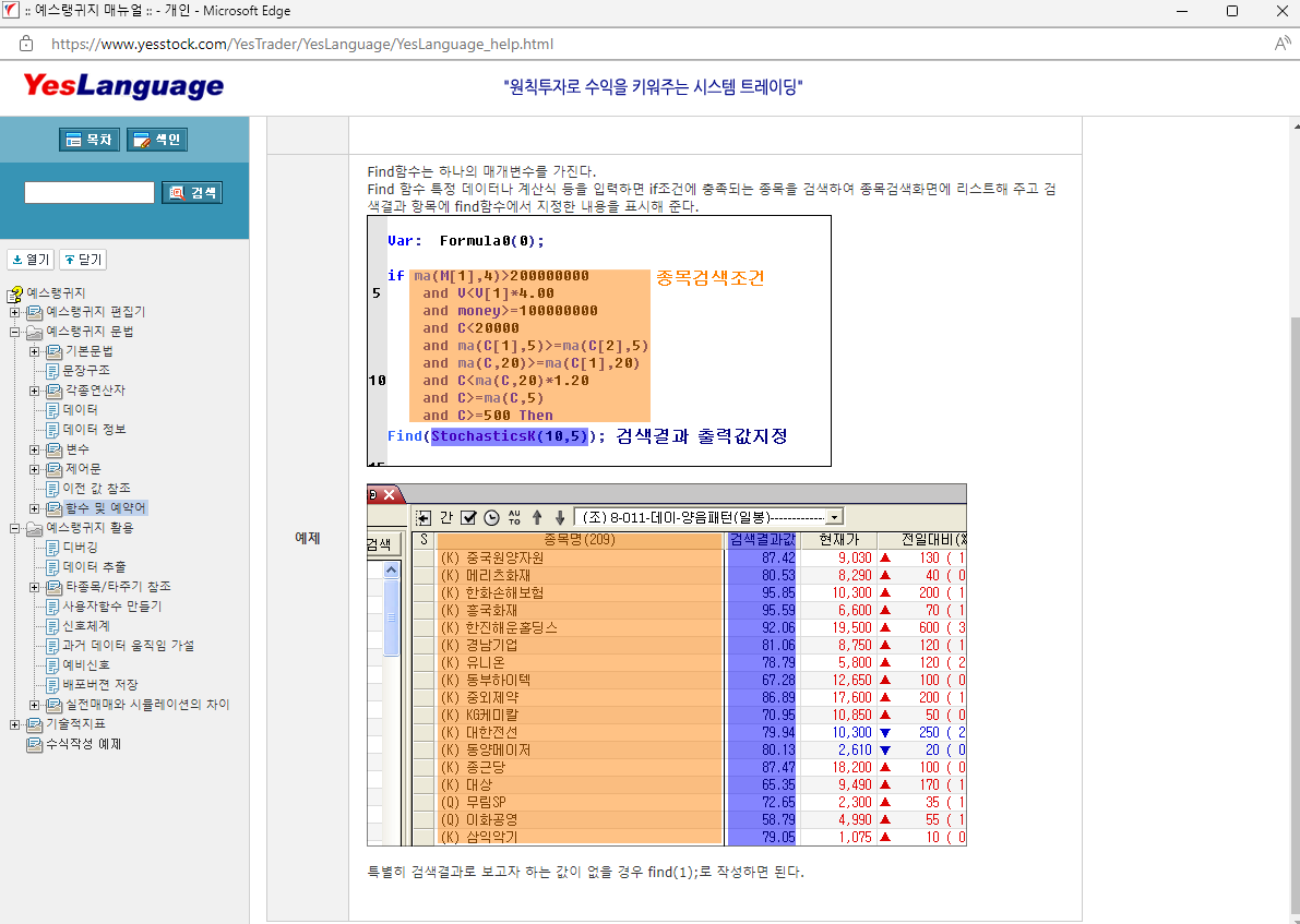 안녕하세요 개발자님. 해당 사진은 예스랭귀지 설명서인 종목검색에 대한 설명 입니다.