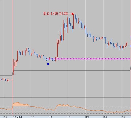 당일날 분봉에서 rsi가 과열진입후 50이하까지 하락후 다시 돌파하는 종목을
