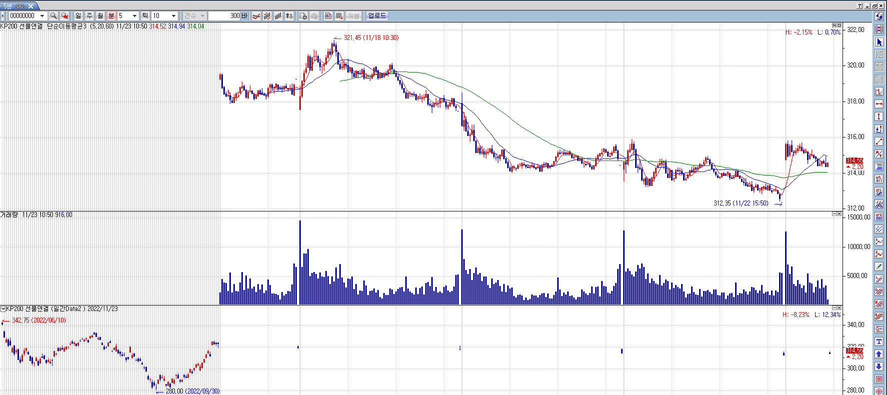 스크린샷 화면은 선물 5분봉 차트와 Data2에 일봉선물차트를 띄운 화면입니다.