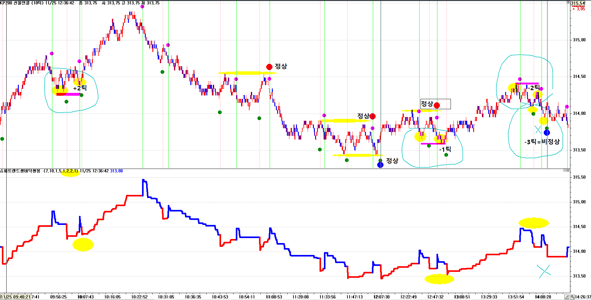 2.시스템:쌍바닥 매수,다음 봉에 매수청산. 쌍봉에 매도,다음봉에 매도청산. 감사합니다.