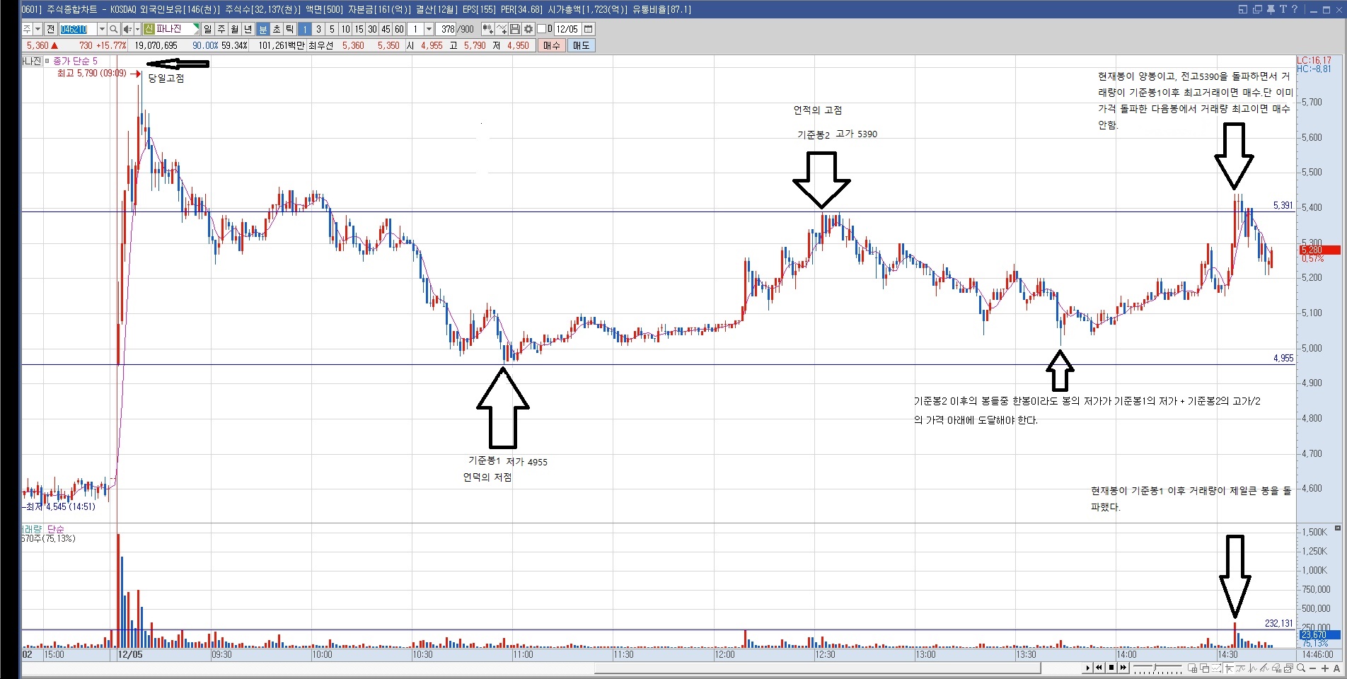 6.위 5번까지 완성되면 현재봉이 양봉이고 기준봉2의 고가를 돌파하면서 현재봉의 거래량이 기준봉1봉부터 현재봉 전봉까지의 봉들중 최고 거래량보다 크면 매수진입, 단 가격돌파이후 봉에서 최고거래량은 매수진입 안한다.