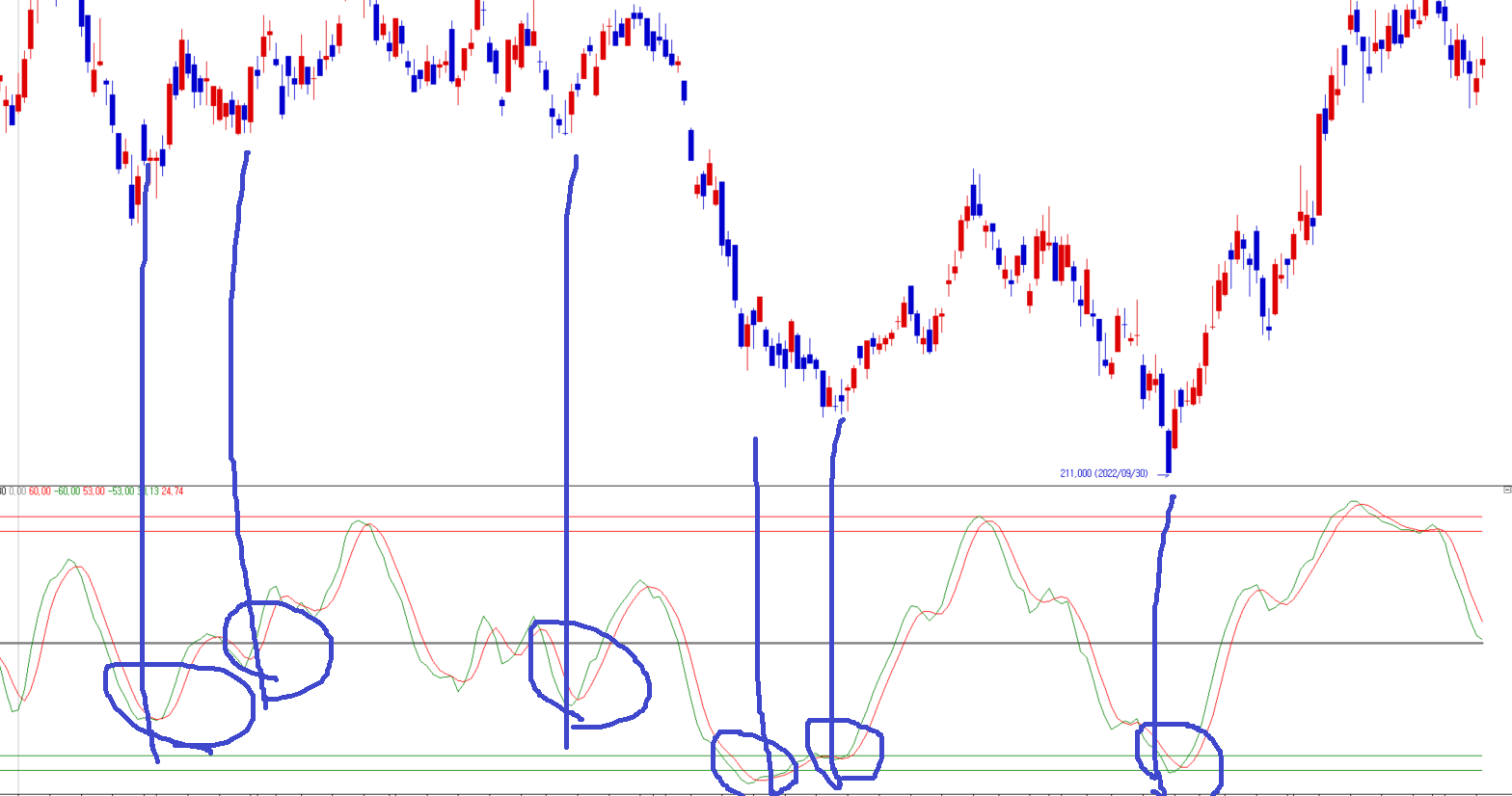 조건만족봉 하단에 삼각형 표시가 나게 작성해 드립니다