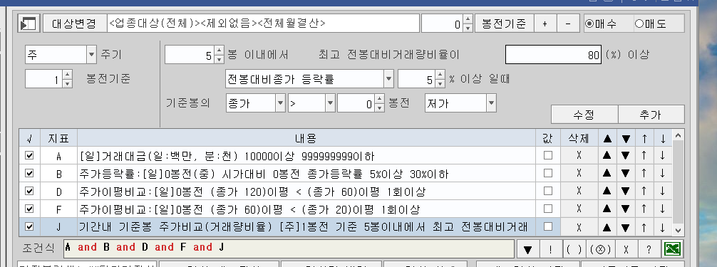 다른조건은 일봉주기이고 J는 주기가 주봉이므로