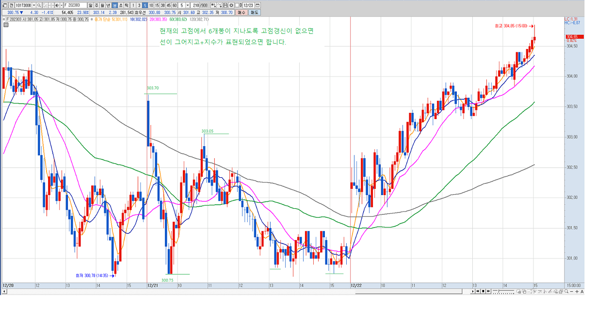 선물 5분 차트에서 현재의 고점에서 10개봉이 지나도록 고점갱신이 없으면