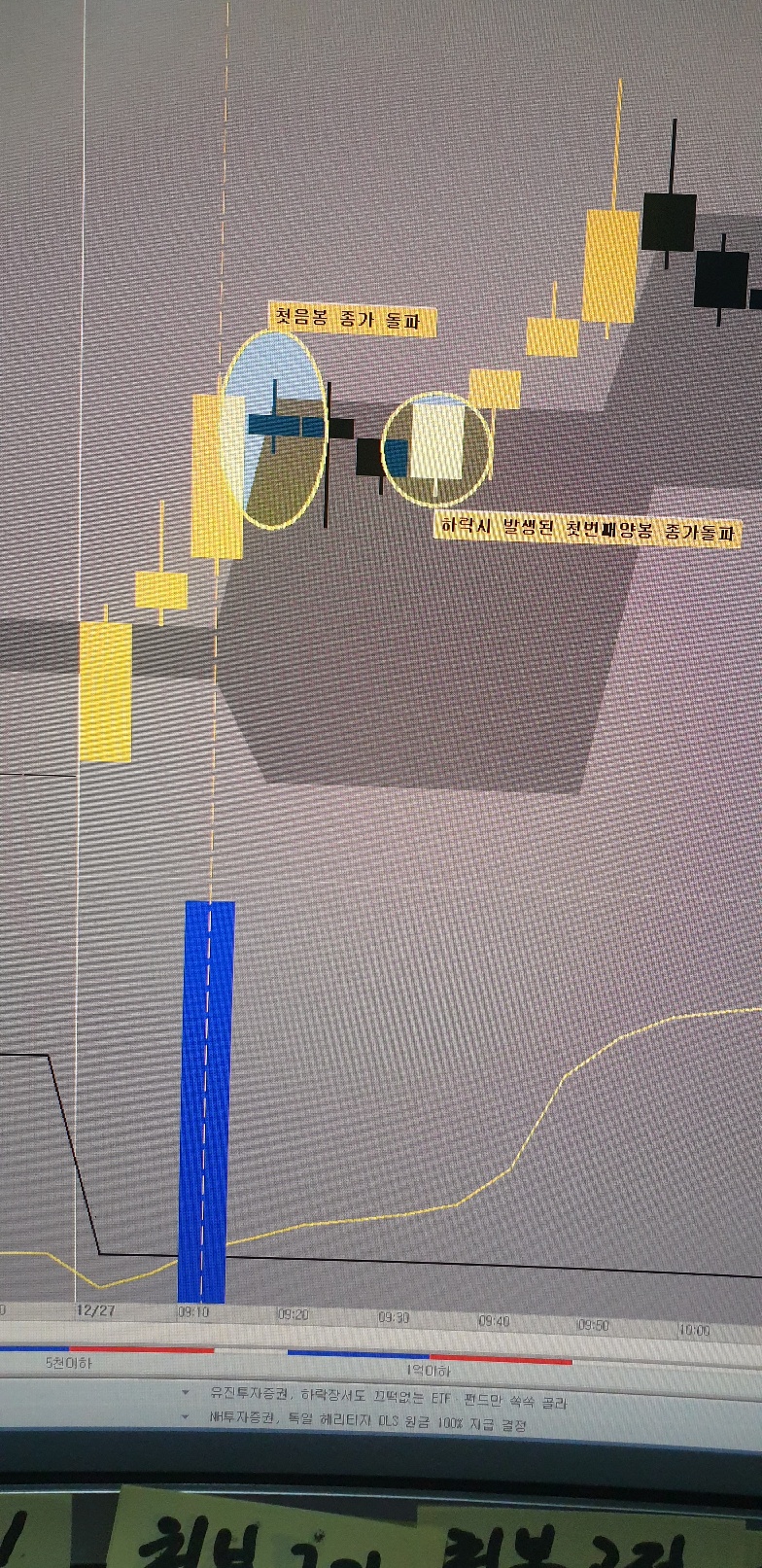 예을 들어 특정거래량이 발생한 분봉을 기준으로 호가가 하락을 했을때 첫번째 음봉종가 돌파 또는 저점기준으로이전 첫번째 양봉종가돌파 검색식을 만들고저 합니다.