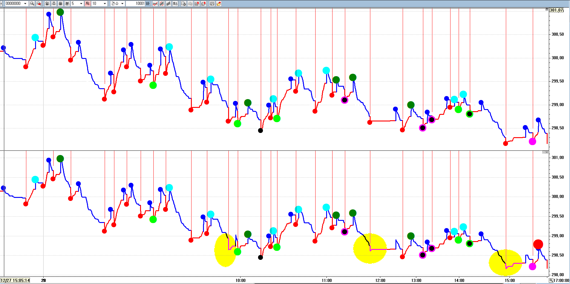 첨부한 파일에서 아래쪽이 수정한 실시간 쓰리바닥인데 표시한 부분에 동그라미 출력이 안됩니다. 161줄의 Text_Delete(tx3); 와 연관된 듯 합니다. 실시간 쓰리바닥은 잘됩니다.