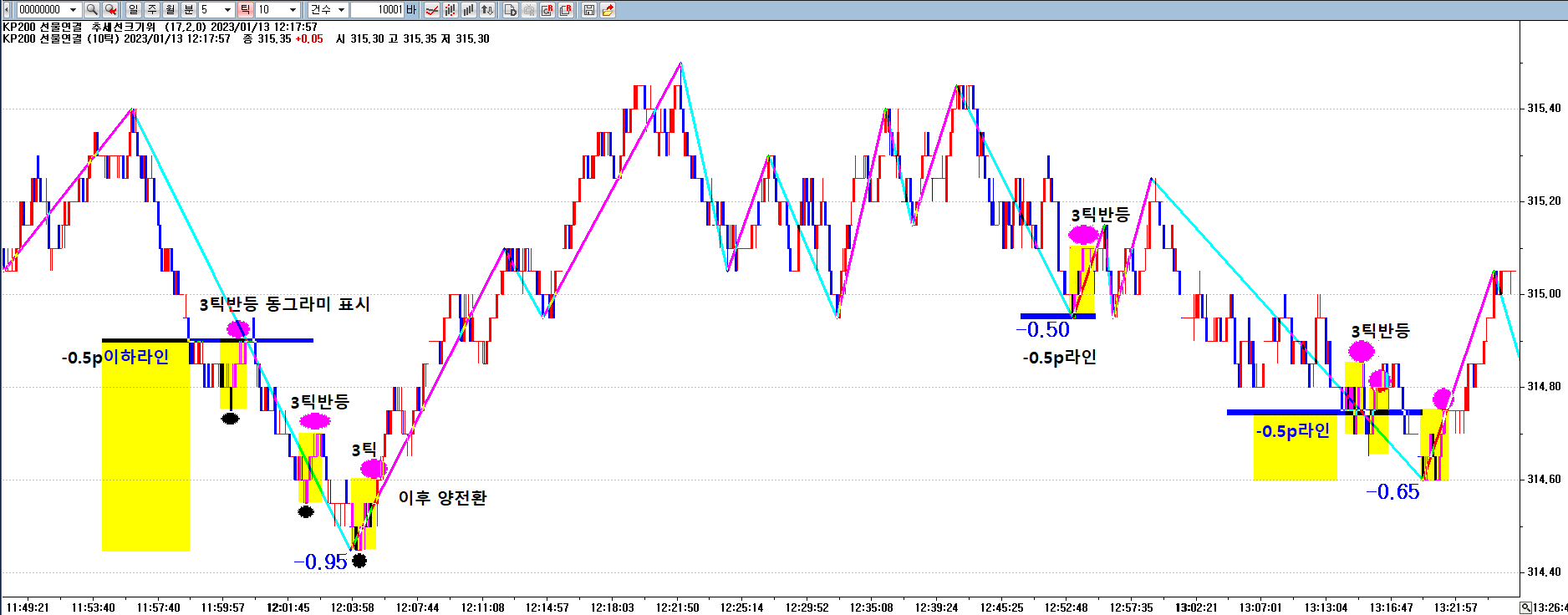 하락 추세선의 크기가 0.5p에 도달했을 때부터 끝날 때까지, 추세 내의 최저가에서 0.15p(3틱) 반등하면 첫 도달 봉에 동그라미 표시.