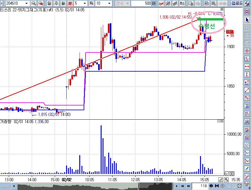 > 상승 추세선 변곡점에 수평선 요청합니다.(최종 변곡점에만 )