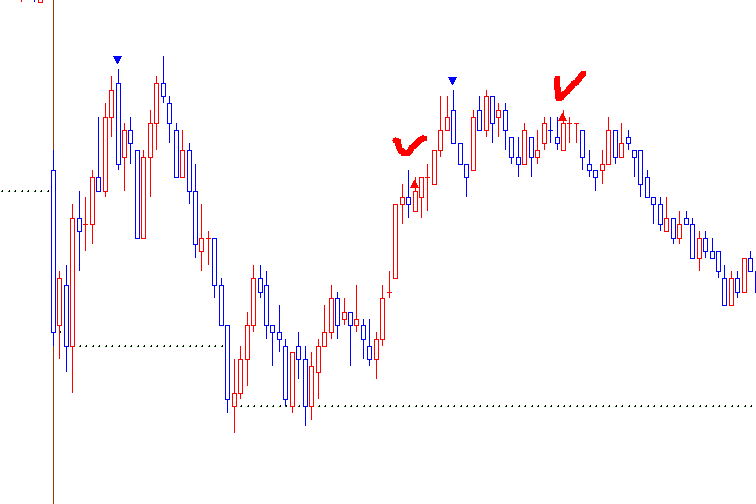 아래 지표식에서 매수 신호가 봉 위에 표시 되네요...