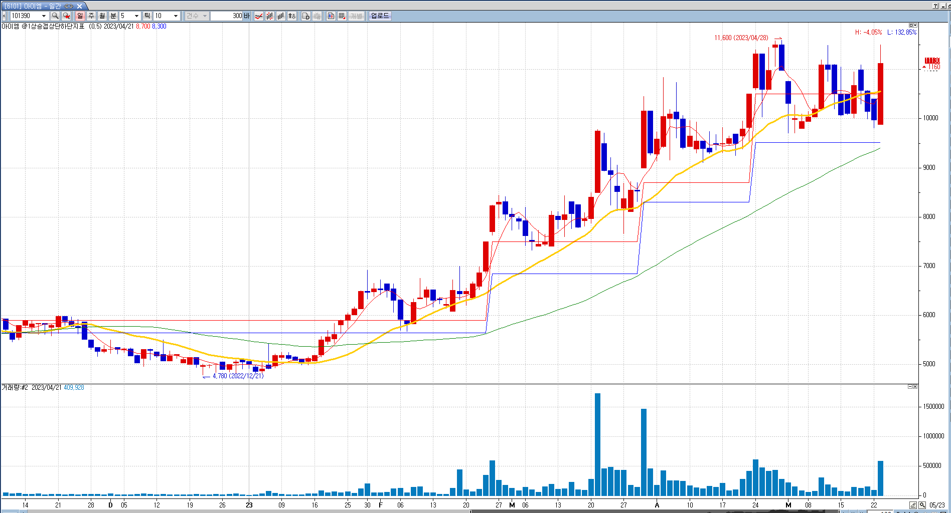 유첨한 이미지는 종목 아이엠 (종목코드 101390), 비율: 0.5로 하여서 보내주신 지표수식 적용 테스트 한겁니다
