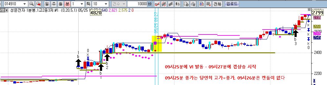 09시 25분에 VI발동, 고가=종가, 09시 26분 캔들은 없고,