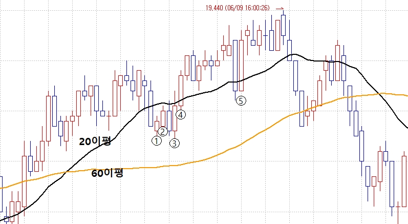 20-60 골든크로스 이후에 20이평아래에서 보이는 양봉은