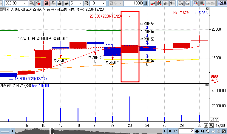 코드로는 아무리봐도 23일에 매도가 되는줄 알았는데 24일에 매도가 되네요..?