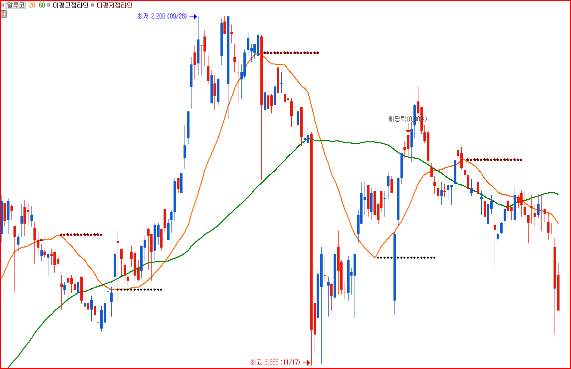 첨부 파일과 같이 20이평과 60 이평 골드 후 20이평의 고점 라인을 긋고 싶습니다