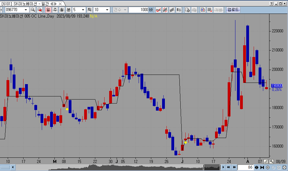 첨부한 그림(SK이노베이션)에서 보면 5월 9일과 7월 4일에 노랑점이 찍혔습니다