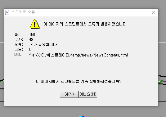 안녕하세요 예스스탁입니다. 올려주신 스크립트 오류는 html에서 발생하는 내용으로 뉴스때문에 발생하는 오류 입니다. 차트나 수식과는 관련이 없습니다. 뉴스화면이나 티커바에서 뉴스를 클릭하시면 뉴스내용이 뜨게 되는데 해당 뉴스의 html에 내부오류가 있으면 해당 스크립트 오류가 있으면 해당 메시지가 발생합니다. 즐거운 하루되세요 > 처음처럼22 님이 쓴 글입니다. > 제목 : 문의드립니다 > 왜이런오류가뜨죠?