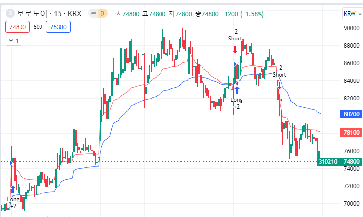 트레이드뷰 차트는 확실히 두선이 따로 다니는데...