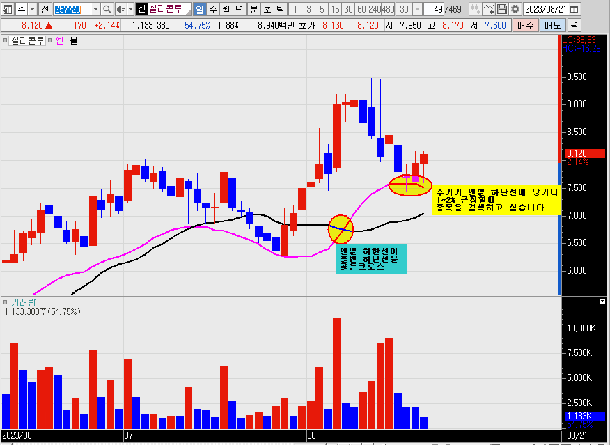 주가가 당일이나 하루 전 엔벨선 하한선에 닿을때나 1~2% 사이 근접하는 종목을 찾고 싶습니다