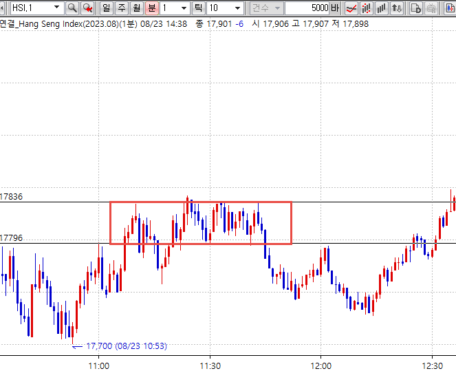 손절 위치는 박스의 중심 가격 (17836 + 17796)/2 으로 설정.