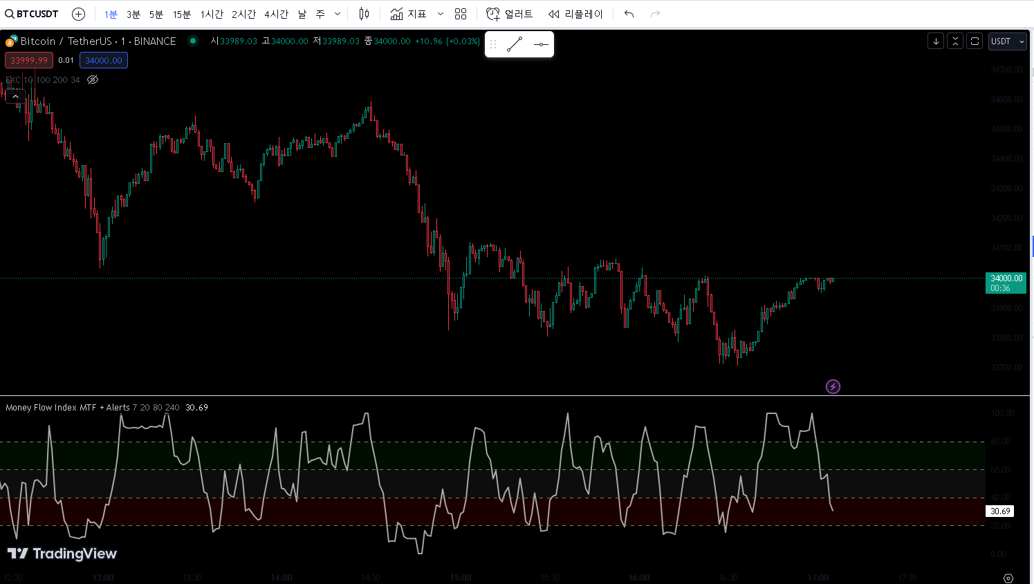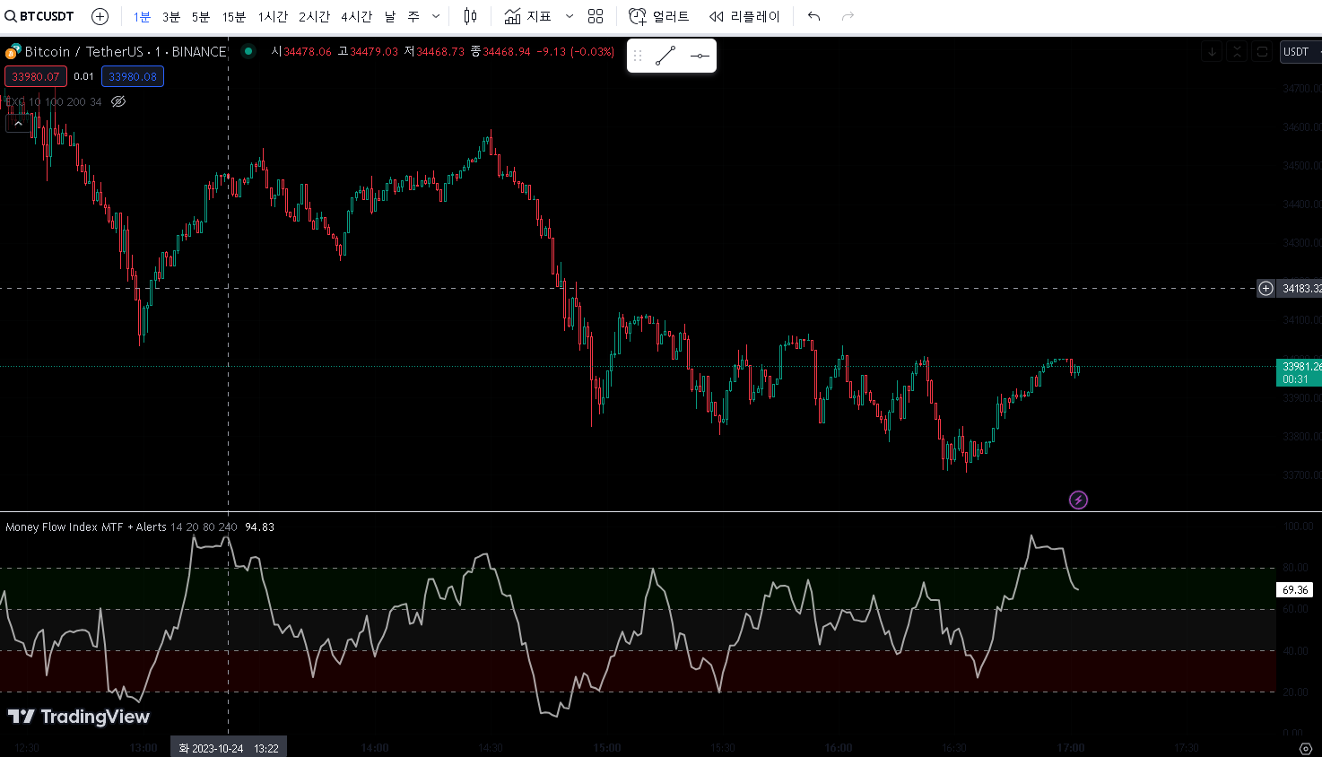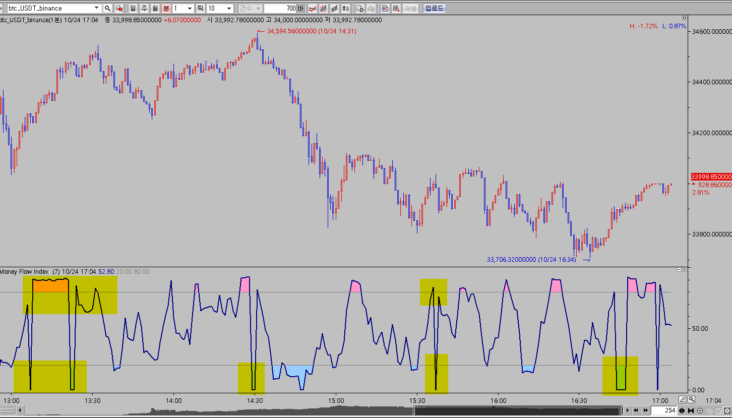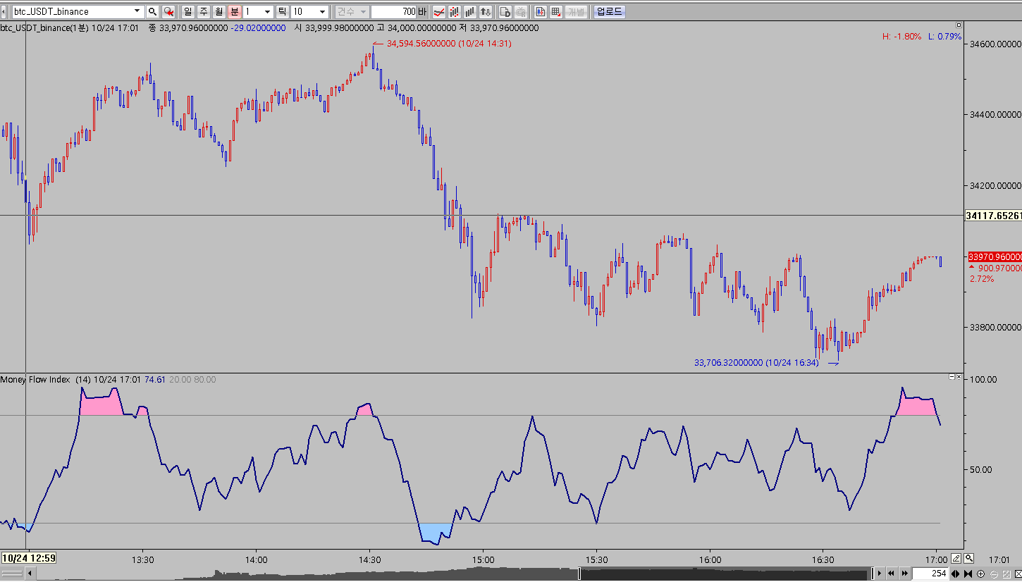 > 1분봉 차트에 money flow index 차트를 적용 시켰습니다.