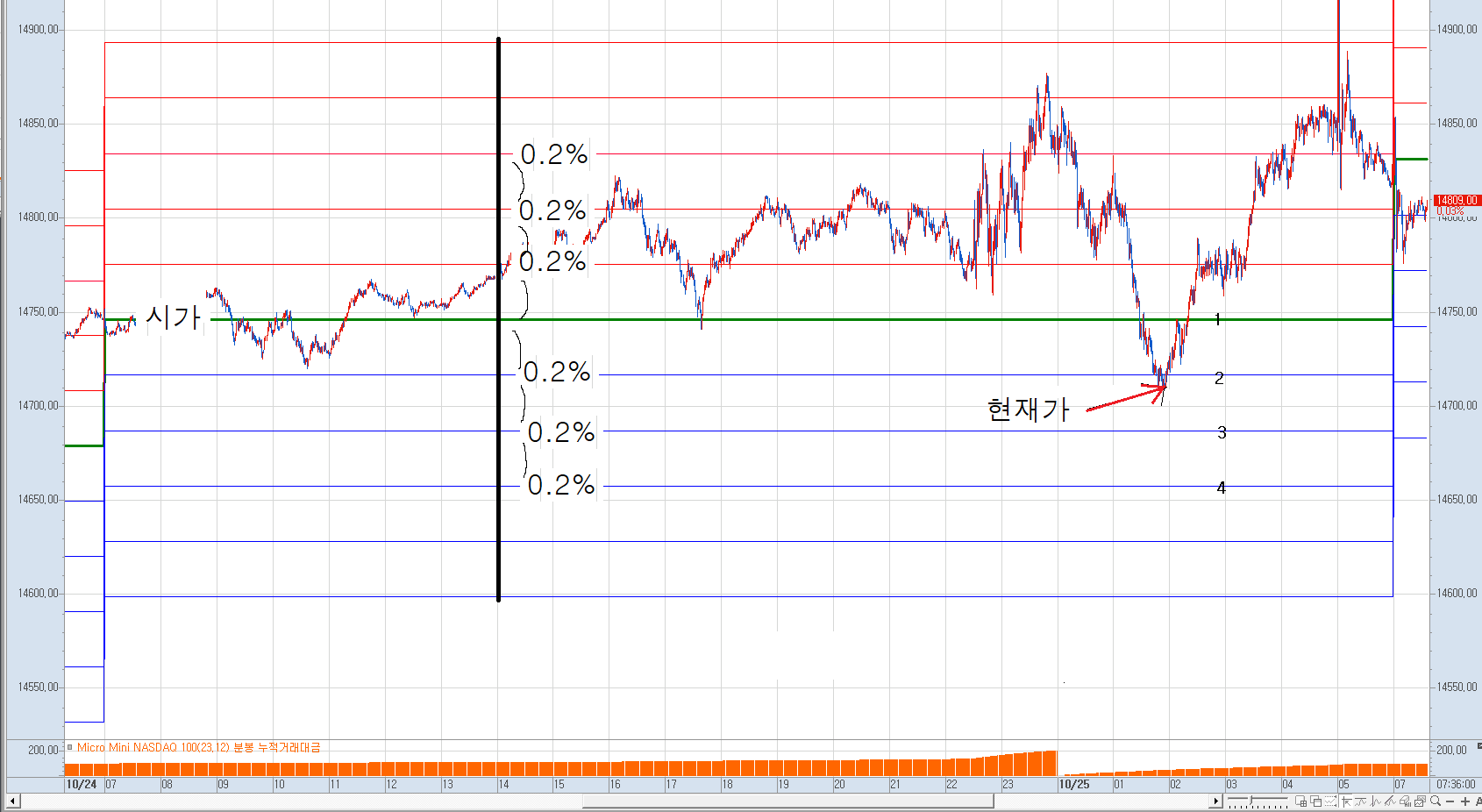 당일(한국시간 오전07시 기준) 시가를 기준으로 위아래로 0.2%씩 간격을 둔 그림이며,