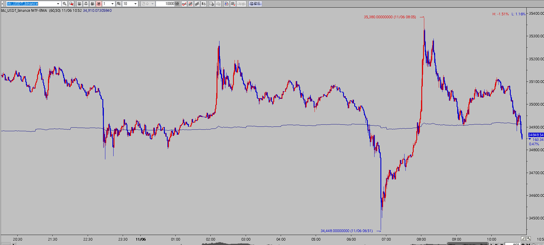 기본으로 제공되는 지표 중 지수이동평균을 적용해 보시면