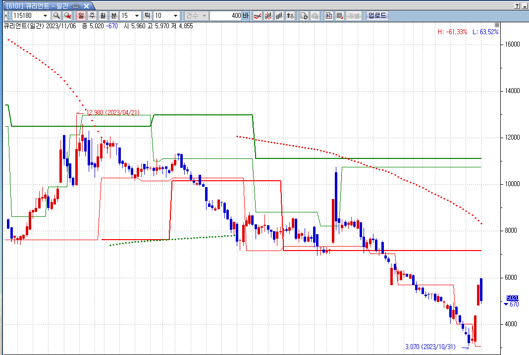 3)오늘봉을 제외하고 5봉간 조정폭이 -15% 이상 (최고가 대비 최저가의 변동폭이 아닙니다)