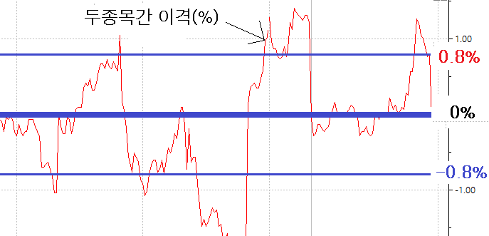 예) 그림과 같이 두종목간 이격이 +0.8% 이상 또는 -0.8% 이하 발생하면 알림이 지속적으로 발생