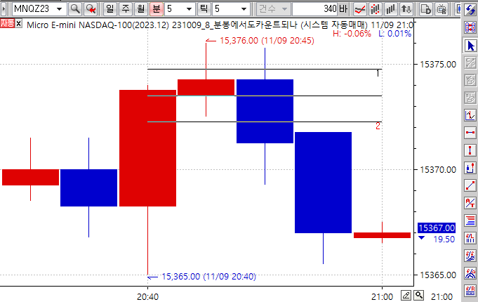 10틱에서는 상단선과 하단선을 왔다갔다 터치하는 횟수가 잘 세어지는데요.