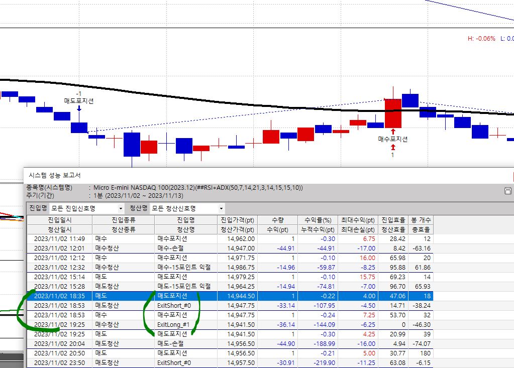 1. (문의사항) 그림 1번에서 보시면 익절 청산을 했는데도 성능보고서에는 마이너스로 나오는데 왜 그러는걸까요??