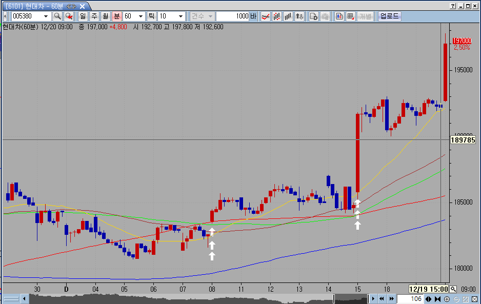 첨부한 현대차 그림으로 예를들면 화살표로 표시한 8일과 15일의 첫봉이 되겠지요