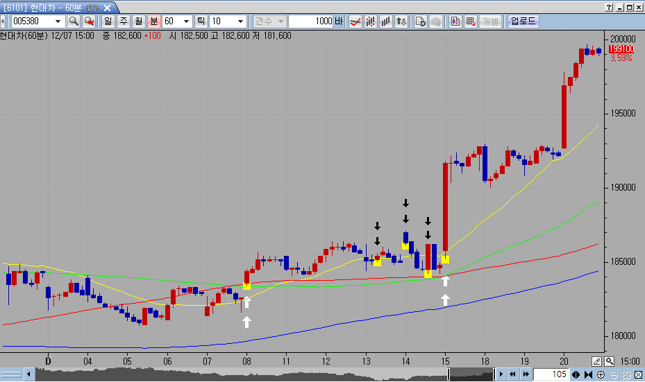 결론은 첫봉인 9시 봉이 상향돌파하면서 양봉일 때만 신호가 표시되어야 합니다