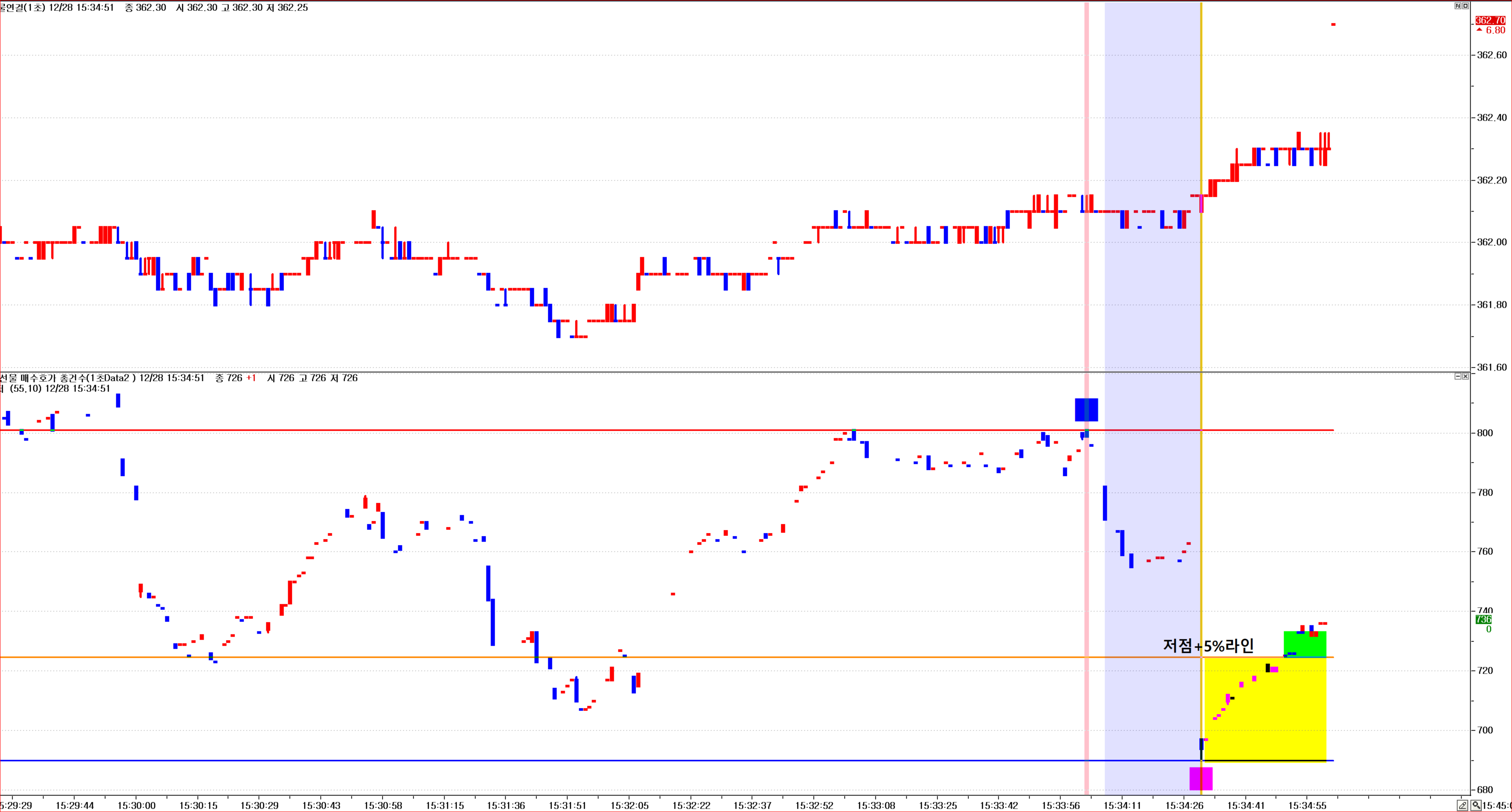 최저가 라인의 +5% 선을 봉의 "저가"가 상향 돌파하면(고가,종가 아님), 최저가 봉부터(TL4) 우측 연장 박스. 현재봉의 "저가"가 +5% 라인을 하향 붕괴하면 박스 삭제.