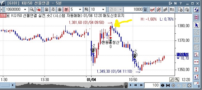 실제 전략실행차트[6101]에서도 매도 청산 신호가 떴습니다.