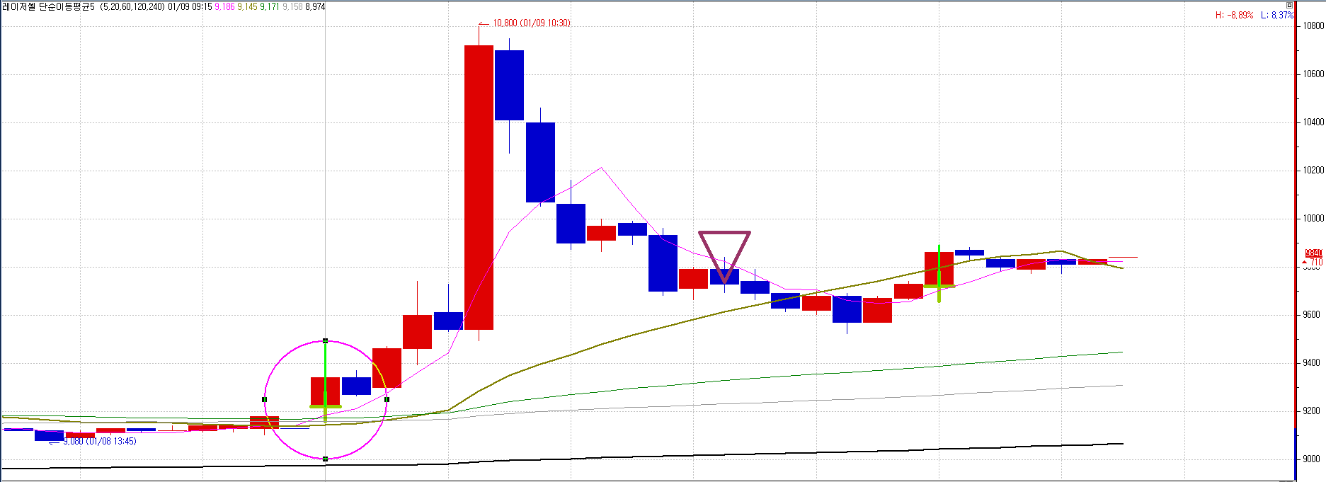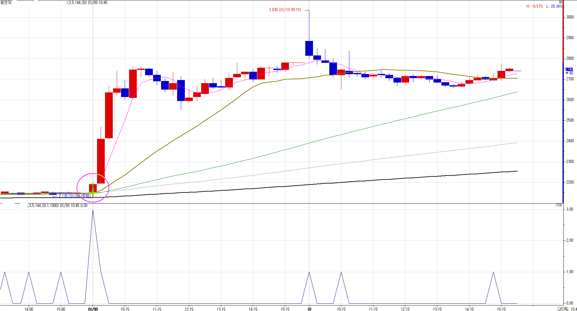 p = (highest(high,단기)+lowest(low,단기))/2;
