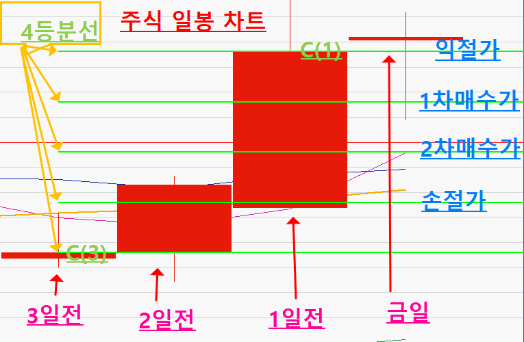 2. C(1) - (C(1) - C(3))*2/4 이하 하락 후 저점 대비 5틱 이상 상승 시 6십만원 2차 시장가 매수