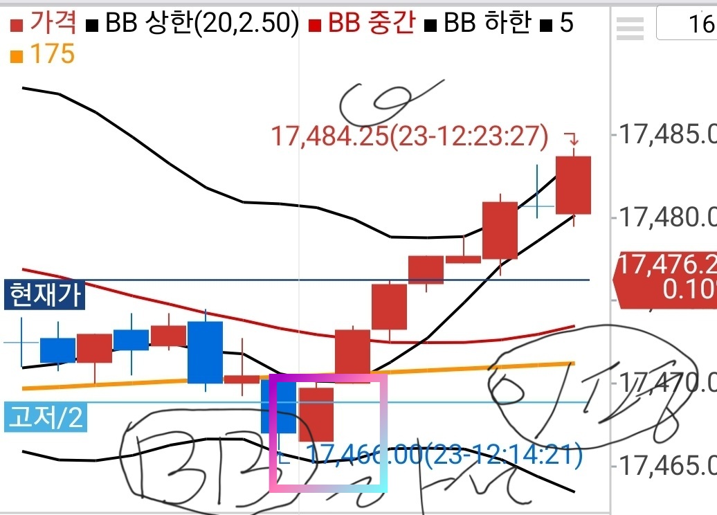이평60선과 볼밴하단선폭이 반드시 조건에 들때진입