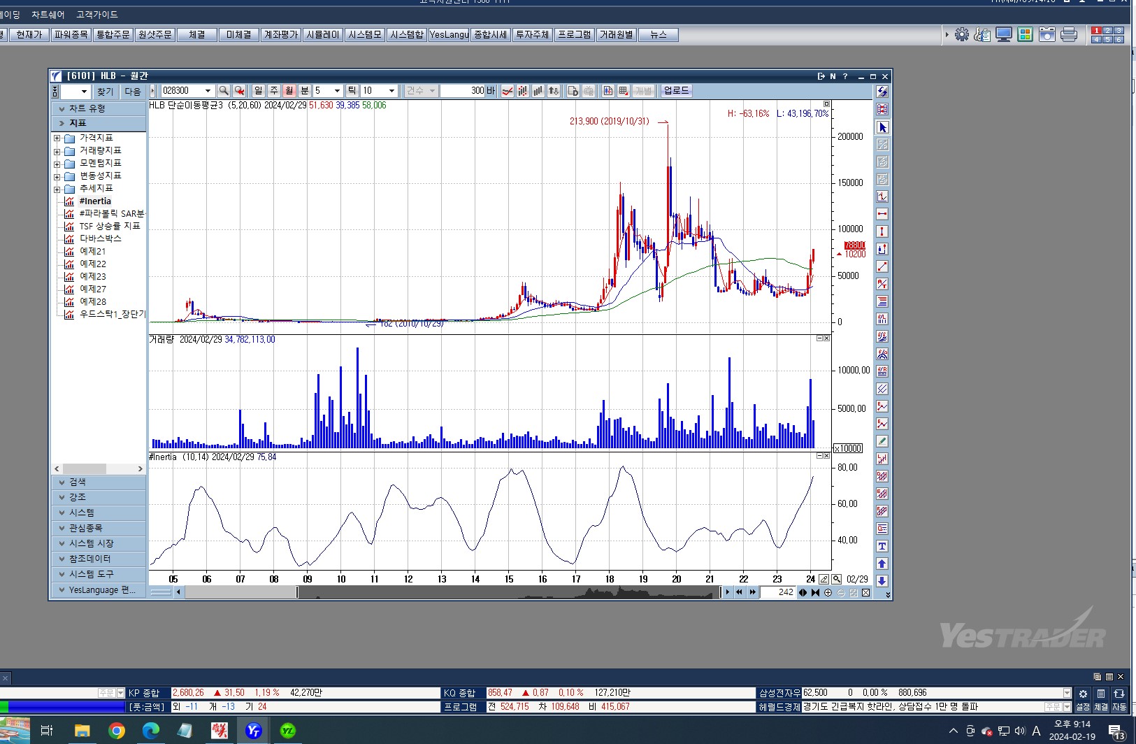 동 지표를 월봉차트에 띄워서 InertiaV값이 40을 상향돌파하는 종목을 검색하려고