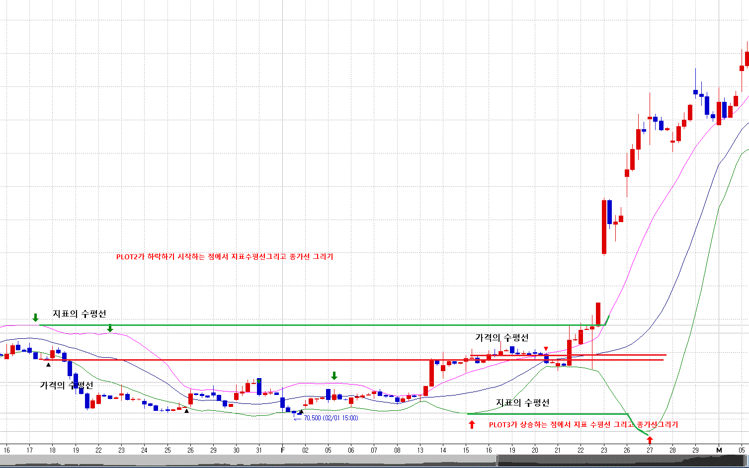 PLOT3 의 지표가 N봉(변수처리) 기간중 지표의 최저가에서 최초로 상승하기 시작하는 첫봉에서 지표의 종가선을 그리고 가격의 종가선을 그립니다.